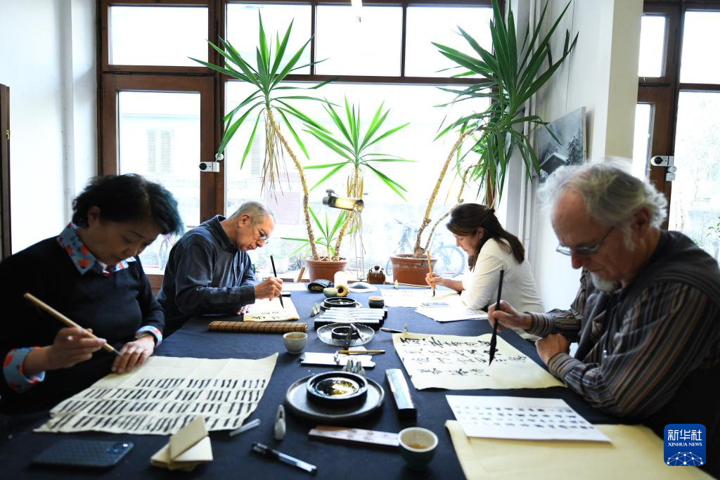 11月19日,在瑞士日内瓦,“乐鱼亭”书法工作室的学员在练习书法。新华社记者 连漪 摄