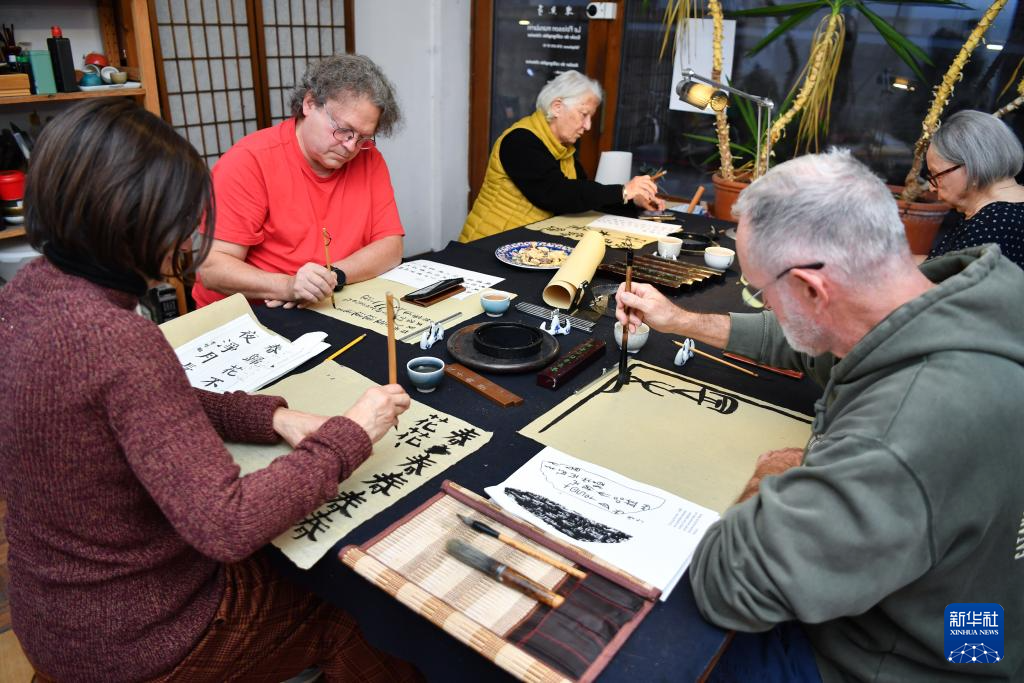 11月19日,在瑞士日内瓦,“乐鱼亭”书法工作室的学员观摩书法老师王飞(左一)写字。新华社记者 连漪 摄