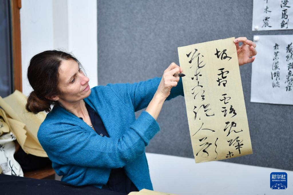 11月19日,在瑞士日内瓦,“乐鱼亭”书法工作室学员纳迪娅展示她的习作。新华社记者 连漪 摄