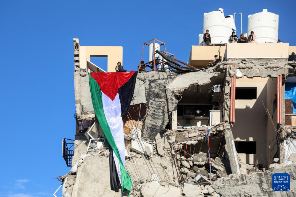 12月2日,在加沙地带南部的汗尤尼斯,一面巨大的巴勒斯坦旗帜悬挂在房屋废墟上。