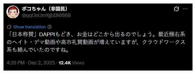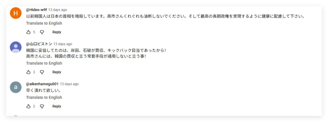 但相当讽刺的是,虽然这些账号宣称他们做的是日本在海外的“反响”,但真正在给这些夸大与失实的日语视频留言和点赞的人,却更像是日本右翼分子。
