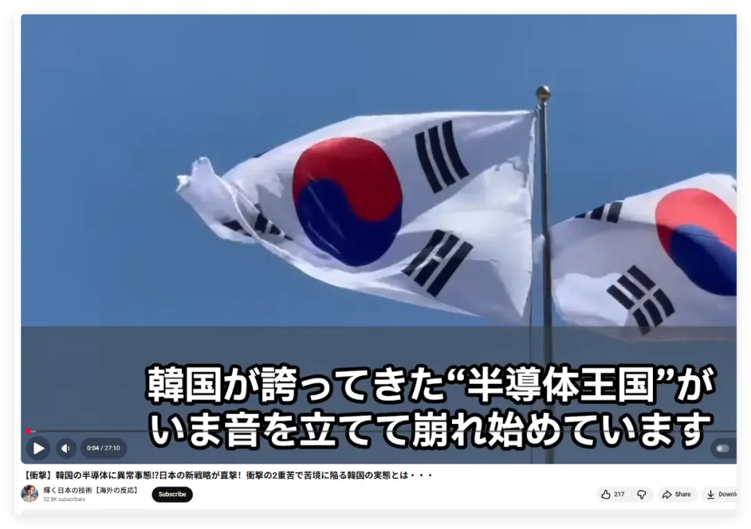 在一则宣称韩国半导体行业“突发异常事态”、被日本的“新战略直击要害”的视频下,就可以看到留言者大多持日本右翼立场,而且多数还表达了对日本首相高市早苗的支持。