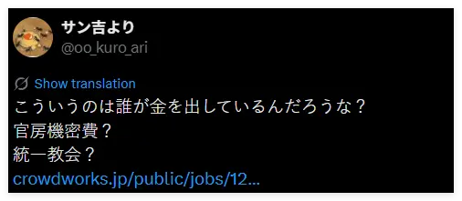 在日本首相高市早苗仍在狡辩,妄图让其发表的涉台荒谬言论蒙混过关之际,有日本网民爆料说,他们这两天在日本最大的招工网站CrowdWorks上,看到了一则公开招聘网络水军去吹捧日本和抹黑中国的招工广告。