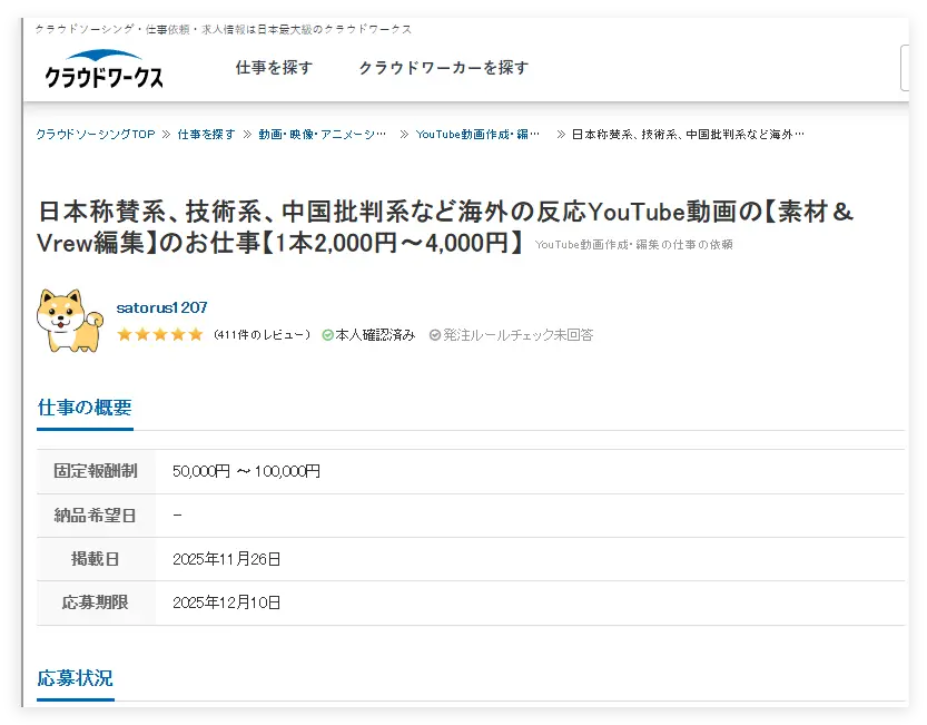 从一些日本网民发布的截图来看,这则于11月26日开始出现在CrowdWorks上的网络水军招聘广告,是由一个名叫satorus1207的账号发布的。该账号简介显示,其代表的是一家名为“双彩虹有限公司”的单位。