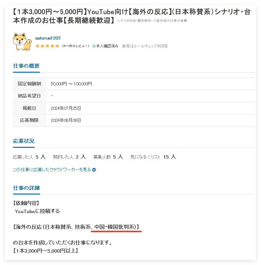 在这则目前引起不少日本网民关注的招工广告中,发布账号satorus1207宣称,他的公司在招募能通过AI技术等手段制作“日本夸赞类、技术类,以及中国批判类”等视频内容的人员,并会按照产出的视频量支付报酬。单条报酬为2000日元至4000日元(约合人民币90元到180元)。此外,账号satorus1207还要求应聘者必须“热爱日本”。