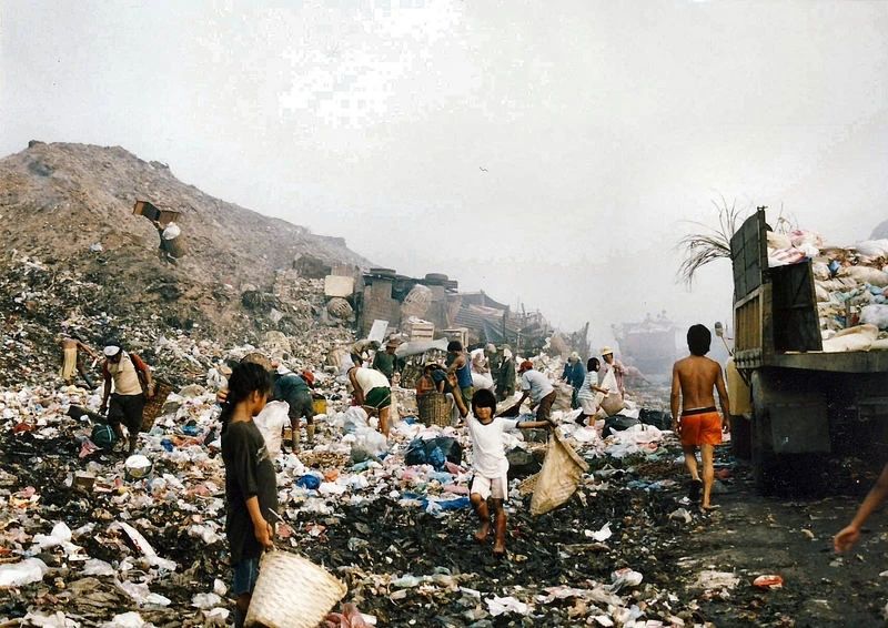 而“快乐之乡”的所在地,过去曾有一座“山”——“冒烟山”。从上世纪50年代起,这里便是马尼拉的主要垃圾倾倒地。每天,成百辆垃圾车从城市各个角落驶来,将废弃的塑料、纸屑、厨余、破旧家具甚至工业废料倾泻于此。久而久之,成千上万吨废弃物堆积成一座高达60多米的“山”。垃圾中滋生的甲烷气体持续燃烧,让山体常年冒着烟,远远望去宛如一座“活着的火山”,“冒烟山”因此得名。