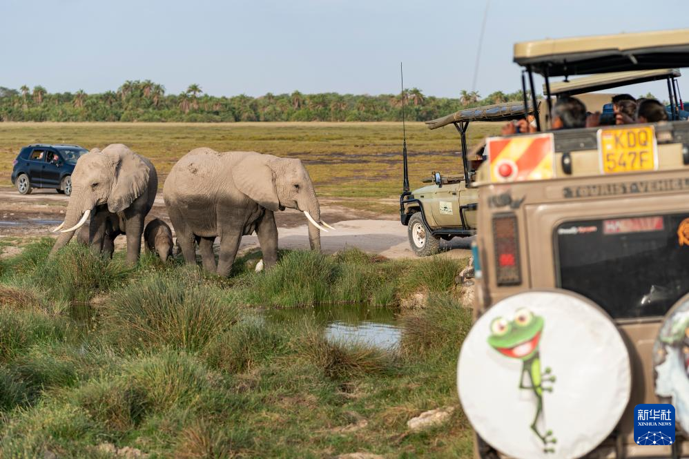 1月8日,游客在肯尼亚安博塞利国家公园乘车观看大象。