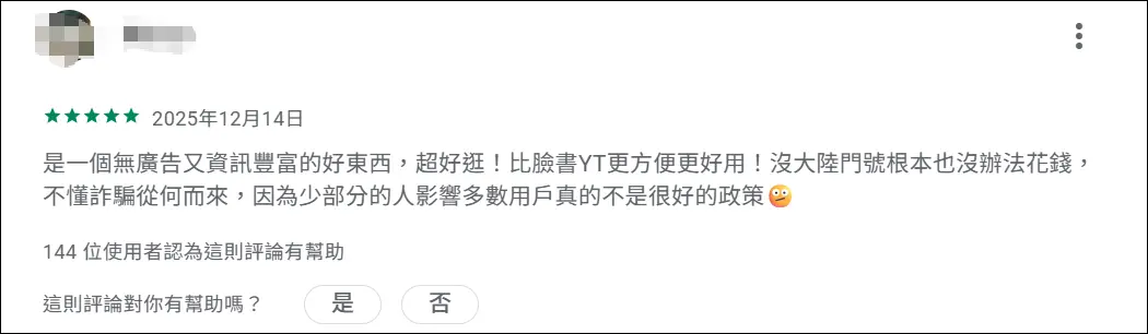 有用户说:“(这)是一个无广告又资讯丰富的好东西,超好逛!比脸书、YT更方便更好用!没大陆手机号根本也没办法花钱,不懂诈骗从何而来,因为少部分的人影响多数用户真的不是很好的政策。”