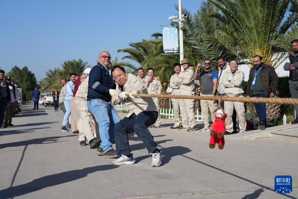 2月16日,在伊拉克瓦西特省艾哈代布油田,中、伊员工一起参加拔河比赛。