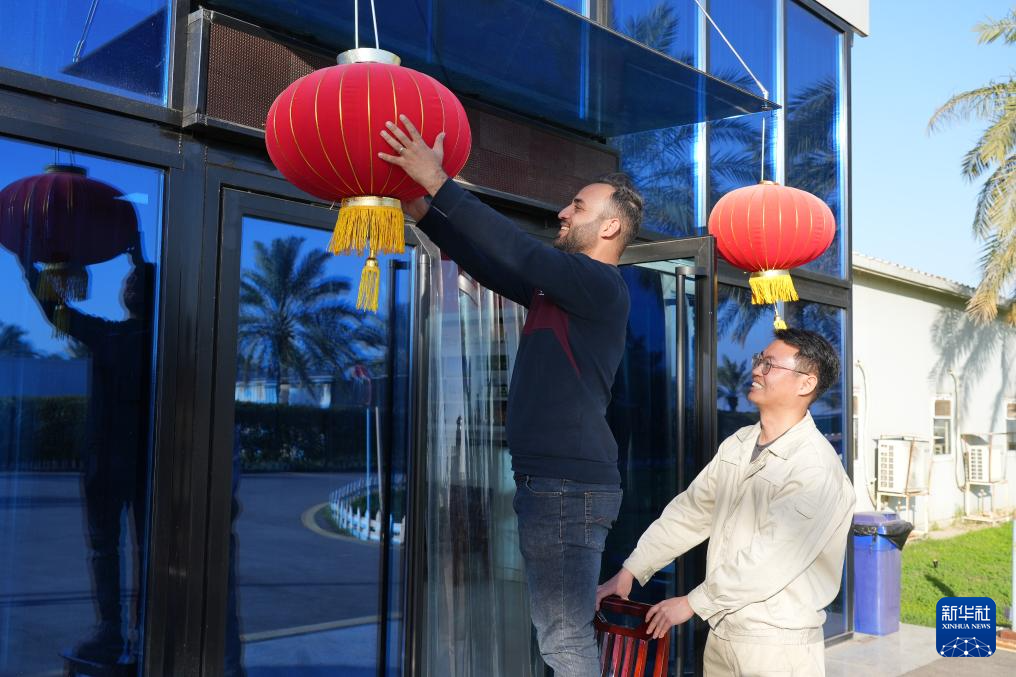 2月15日,在伊拉克瓦西特省艾哈代布油田,中、伊员工一起挂灯笼。