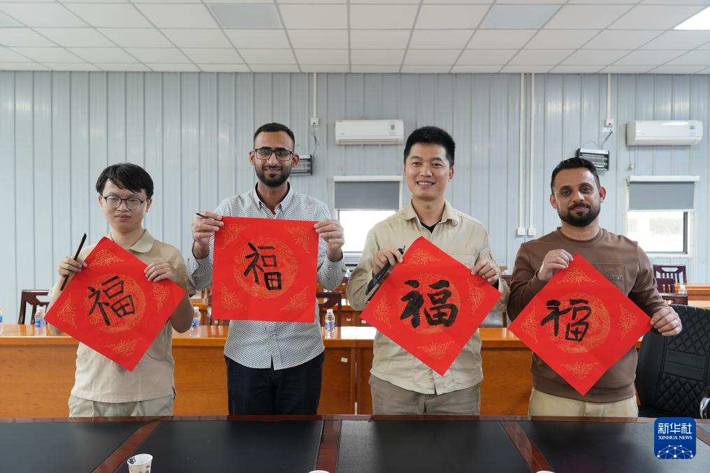2月15日,在伊拉克瓦西特省艾哈代布油田,中、伊员工展示写好的“福”字。