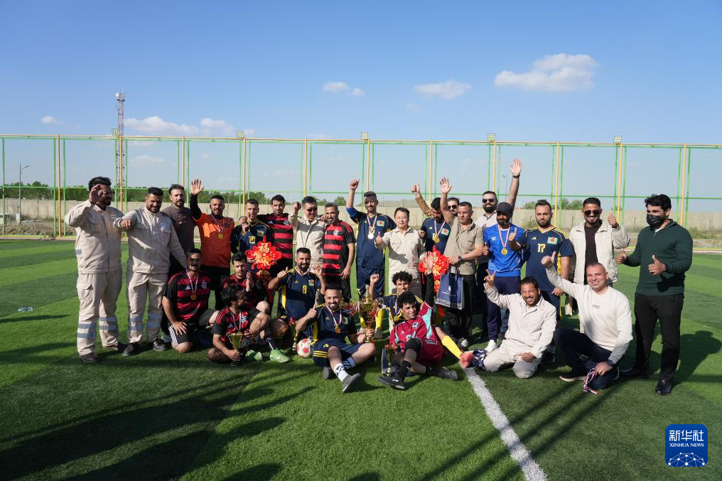 2月15日,在伊拉克瓦西特省艾哈代布油田,中、伊员工在新春足球赛后合影留念。