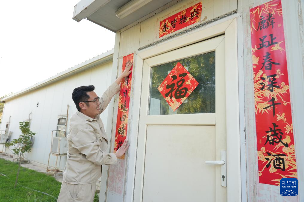 2月15日,在伊拉克瓦西特省艾哈代布油田,一名中方员工在贴春联。