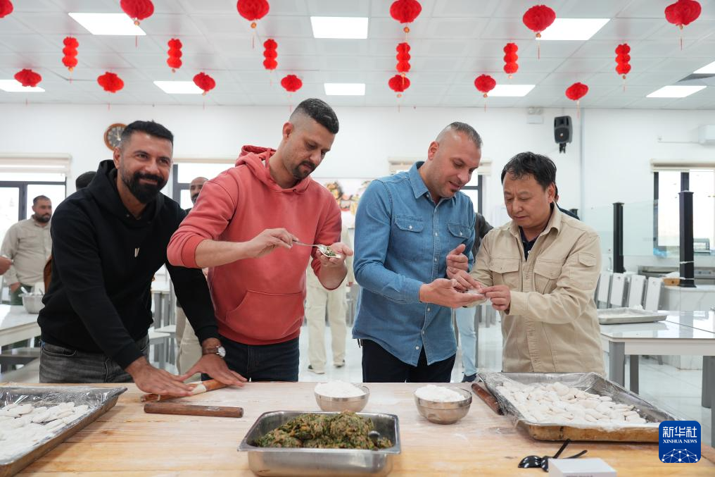 2月16日,在伊拉克瓦西特省艾哈代布油田,中国员工(右一)教伊拉克员工包饺子。