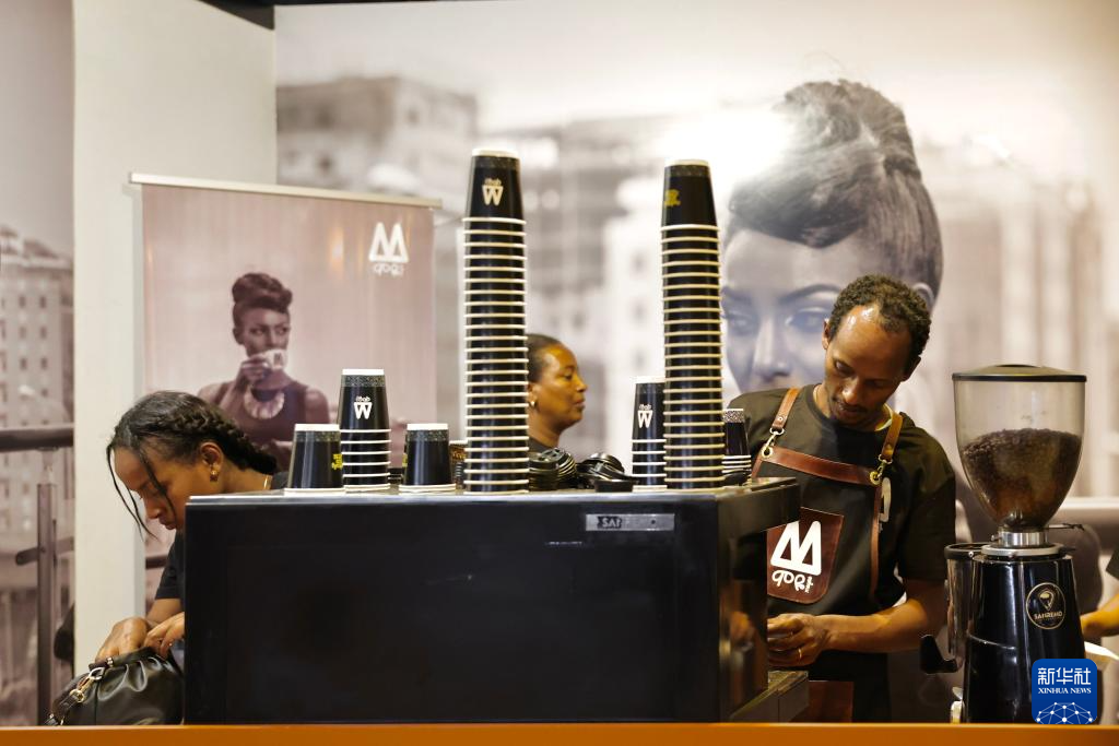2月12日,在埃塞俄比亚首都亚的斯亚贝巴的一家咖啡店,店员为顾客制作咖啡。