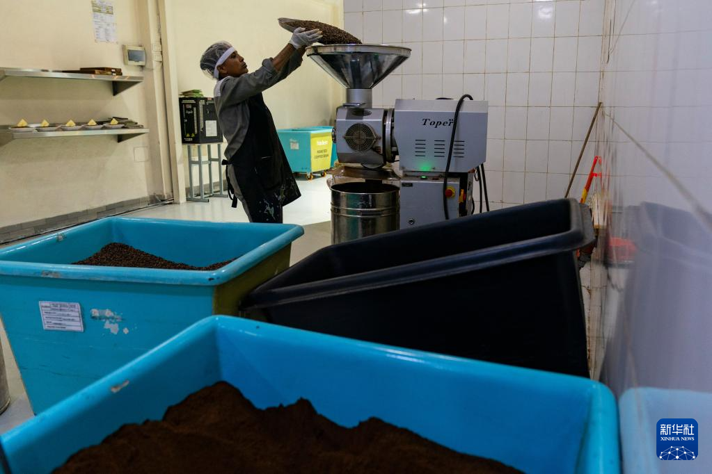 2月13日,在埃塞俄比亚首都亚的斯亚贝巴的一家咖啡加工厂,工作人员用机器将咖啡豆磨成粉。