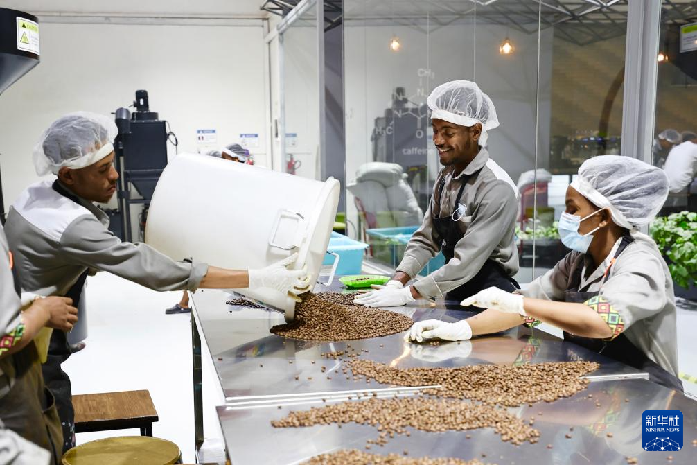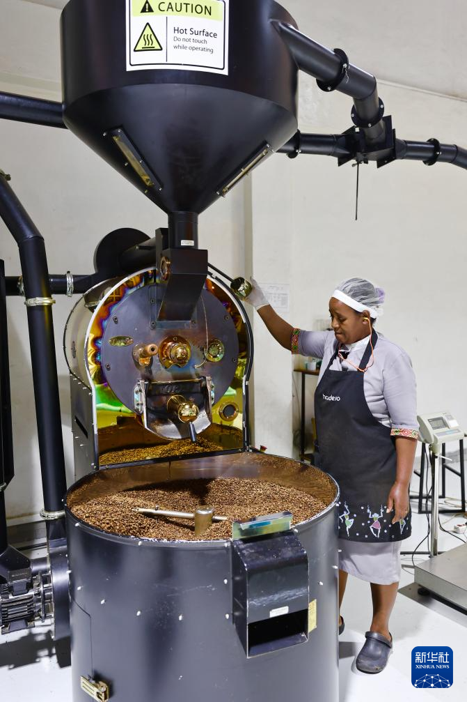 2月13日,在埃塞俄比亚首都亚的斯亚贝巴的一家咖啡加工厂,员工在操作咖啡烘焙机。