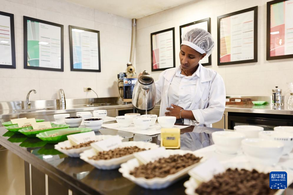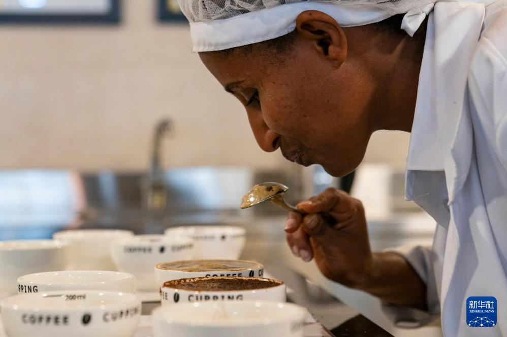 2月13日,在埃塞俄比亚首都亚的斯亚贝巴的一家咖啡加工厂,工作人员在进行咖啡杯测。