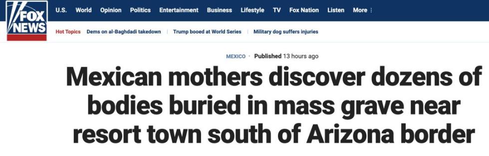 据美国福克斯新闻27日报道,墨西哥官员26日表示,在靠近美国亚利桑那州边境以南的旅游胜地佩尼亚斯科港附近,该国一个民间组织发现了一处乱葬岗,里面至少发现有42具尸体。