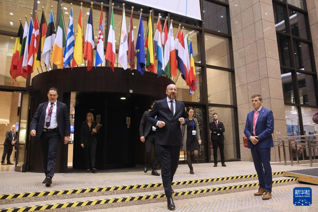 12月15日,在比利时布鲁塞尔,欧洲理事会主席米歇尔(中)在欧盟峰会首日结束后准备接受媒体记者采访。
