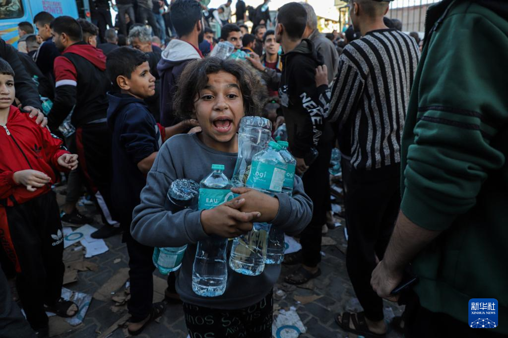11月21日,在加沙地带南部城市汗尤尼斯,民众领取饮用水。