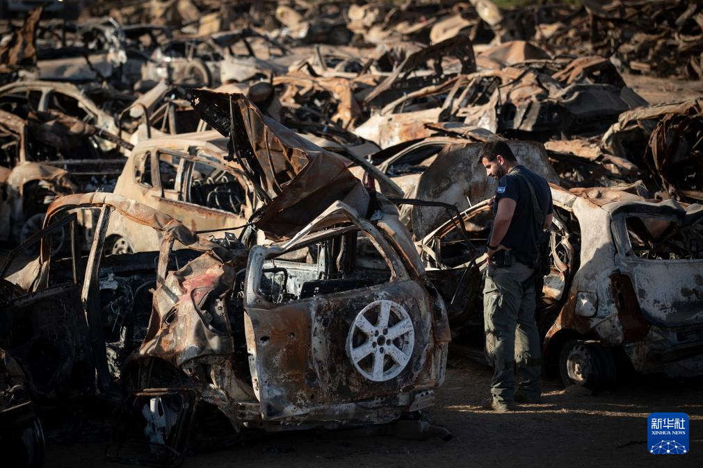 11月6日,在以色列南部城市内提沃特附近,一名男子站在汽车残骸旁。