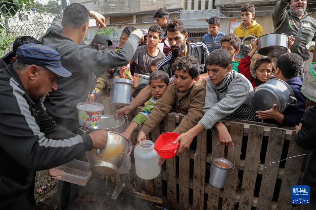 11月19日,在加沙地带南部城市拉法,人们领取救济食物。