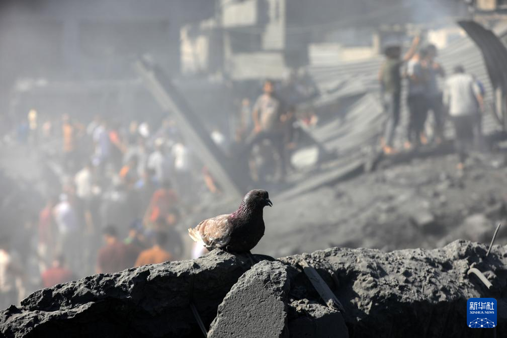 10月26日,在加沙地带南部城市汗尤尼斯,一只鸽子停留在建筑废墟上。