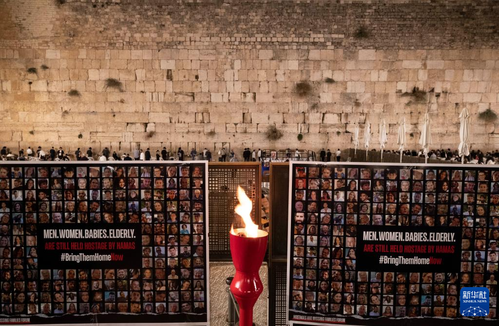 这是11月7日在耶路撒冷老城“哭墙”前拍摄的以色列被扣押人员海报。