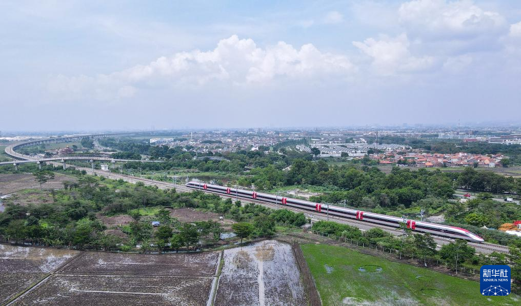 这是12月6日在印度尼西亚万隆德卡鲁尔车站附近拍摄的一列行驶中的雅万高铁高速动车组(无人机照片)。