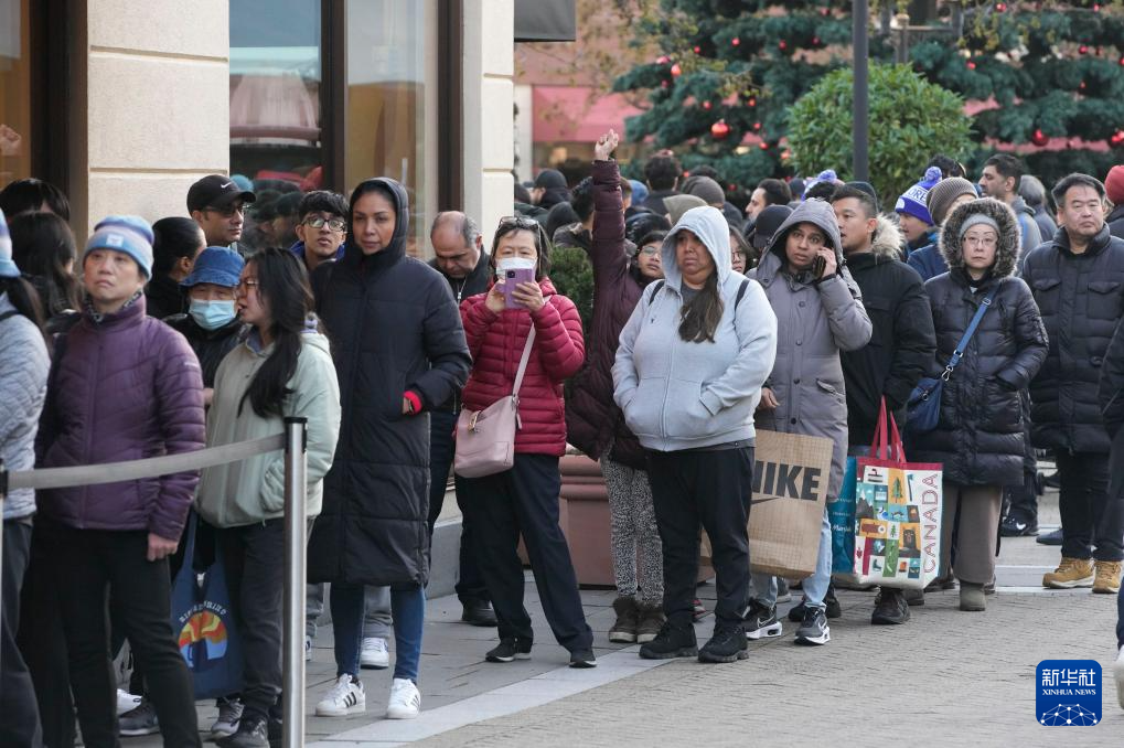 12月26日,在加拿大里士满一家奥特莱斯商城,人们在商店外排队等待购物。