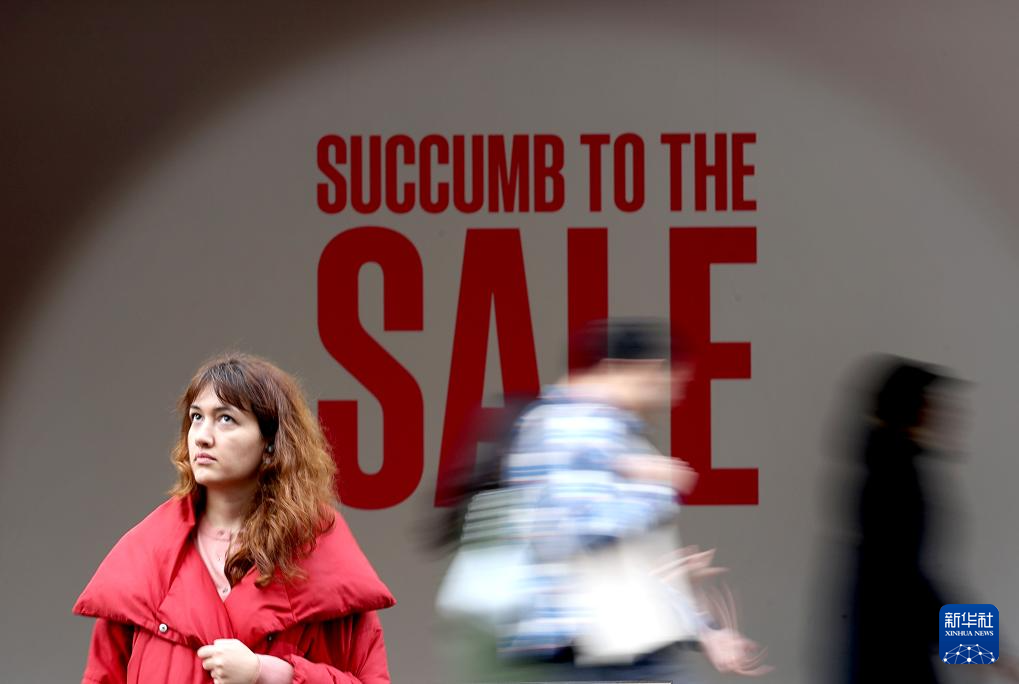 12月26日,在英国伦敦牛津街,一名女子站在促销广告牌前。