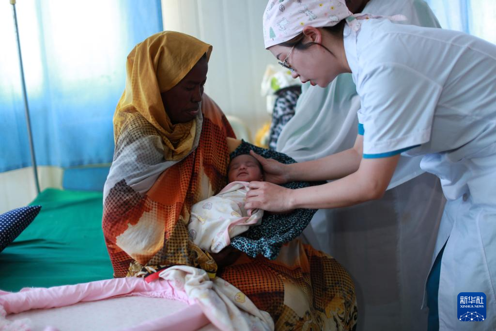 2023年2月22日,中国援苏丹医疗队妇产科医生刘韡在苏丹阿布欧舍医院的病房为一名新生儿做检查。