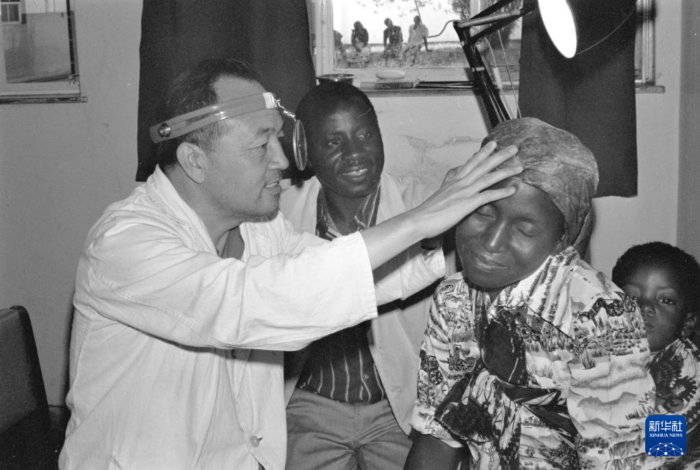 1979年3月,在扎伊尔(即现在的刚果(金))首都金沙萨的金丹堡医院,中国眼科医生在为当地病人检查。