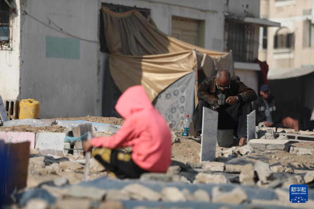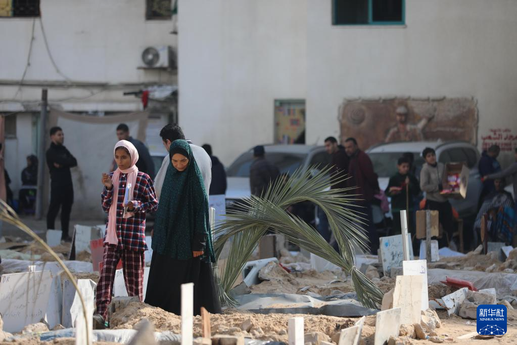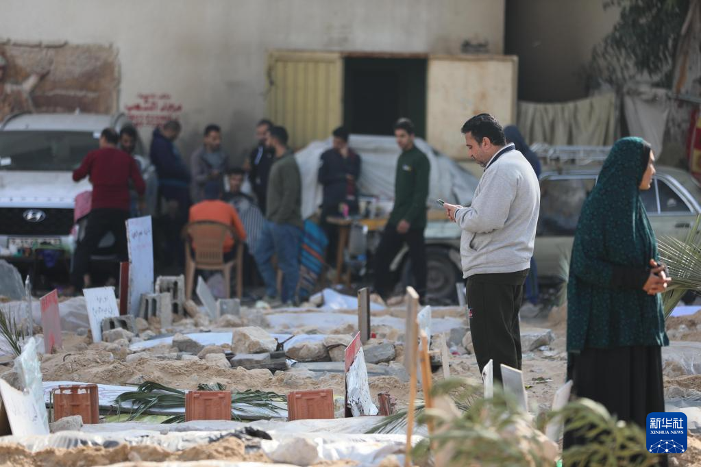 2023年12月31日,人们在位于加沙城希法医院后院的集体墓地悼念逝者。