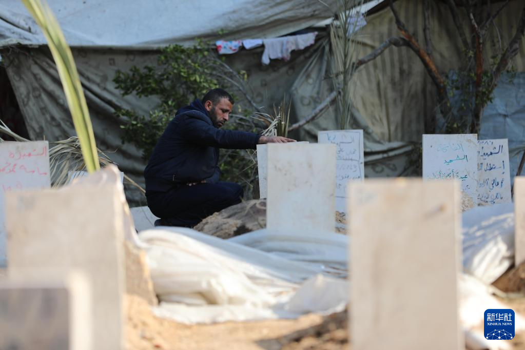 2023年12月31日,一名男子在位于加沙城希法医院后院的集体墓地悼念逝者。
