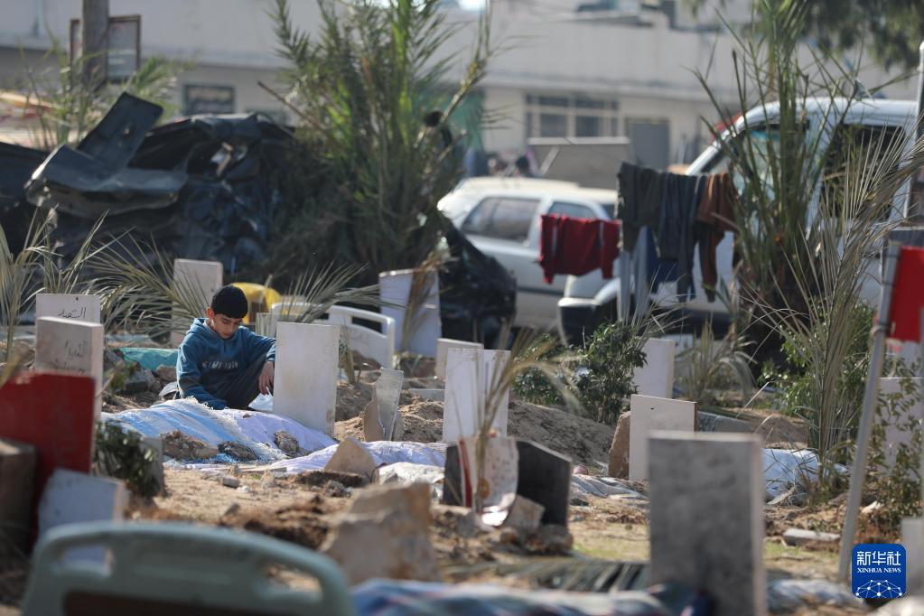 2023年12月31日,一名孩子在位于加沙城希法医院后院的集体墓地悼念逝者。