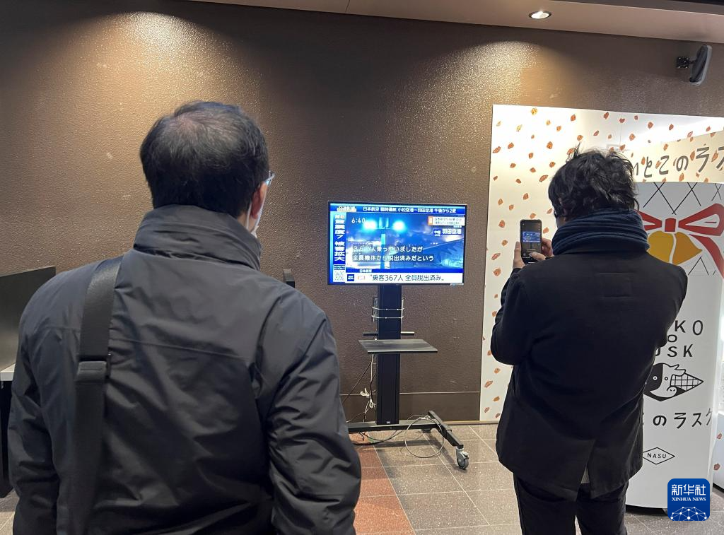 1月2日,在日本东京羽田机场,因机场跑道封闭滞留的乘客观看两机碰撞起火事故新闻。