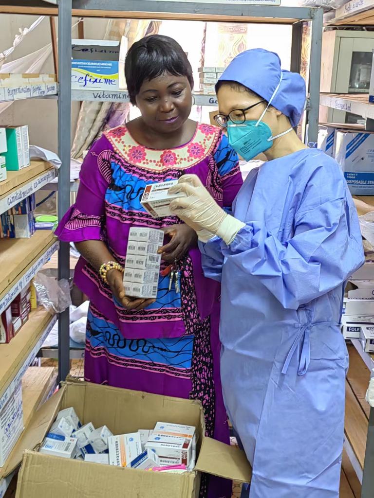 2023年10月12日,嘉兴市第二医院王小琴与当地药师讲解捐赠药品的适应症、用法用量等。新华社发
