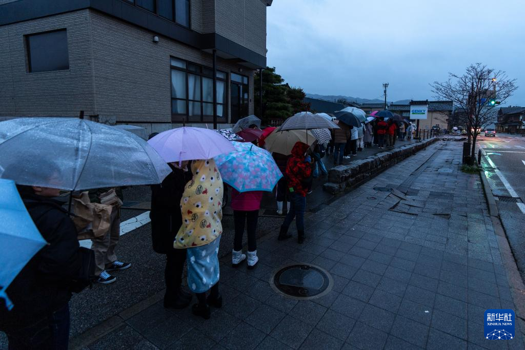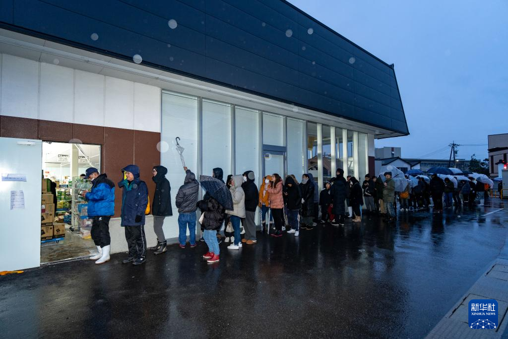 1月3日,在日本石川县轮岛市,市民在一家超市外排队等待采购生活物资。饮用水、方便面及方便米饭等物资限量购买。