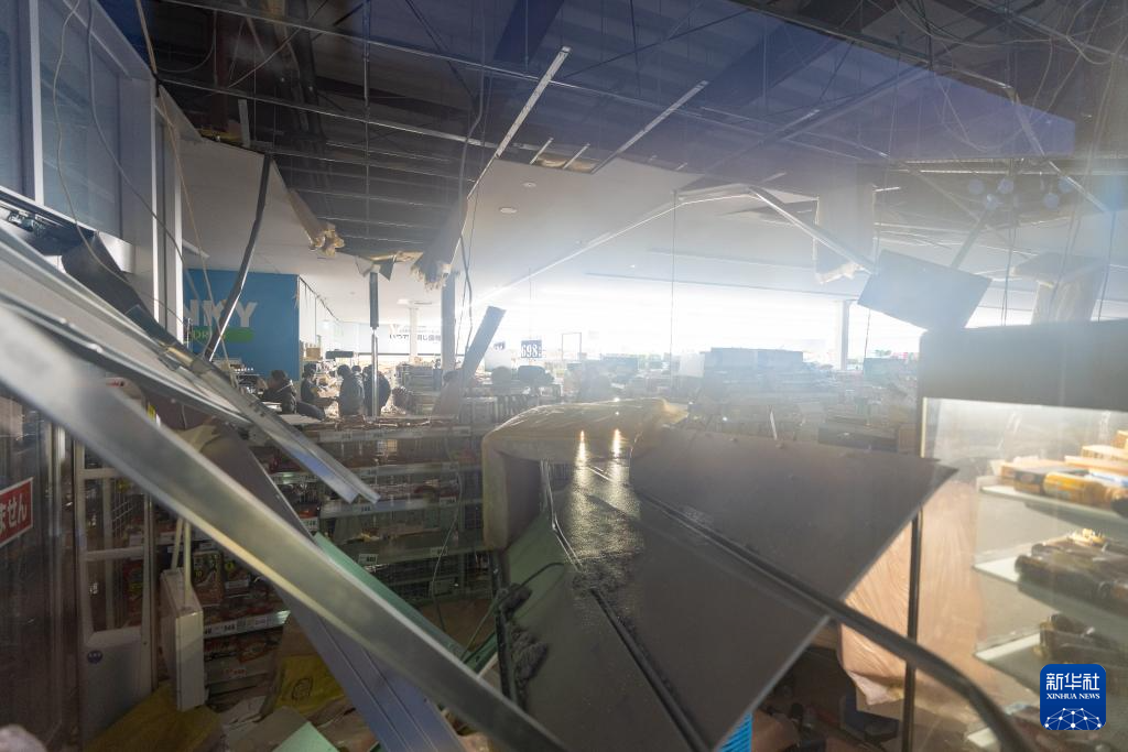 1月3日,在日本石川县轮岛市,市民在一家超市里购物。该超市在地震中部分损毁。