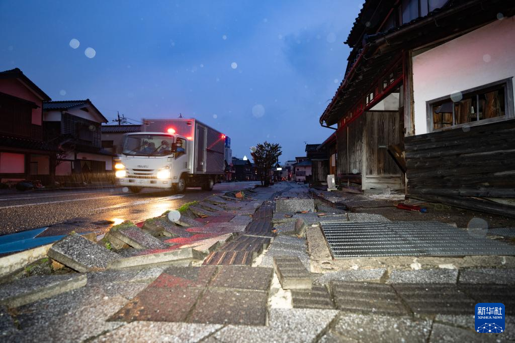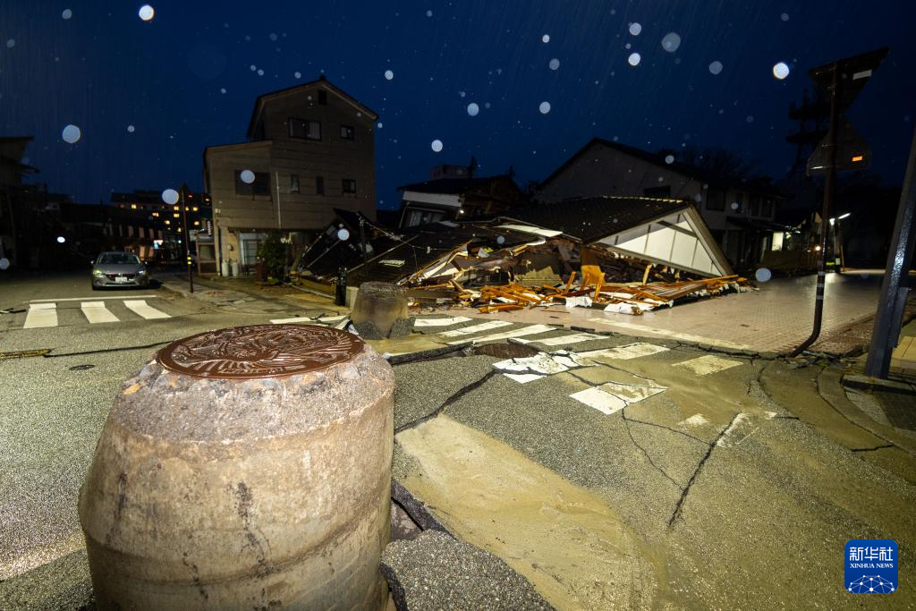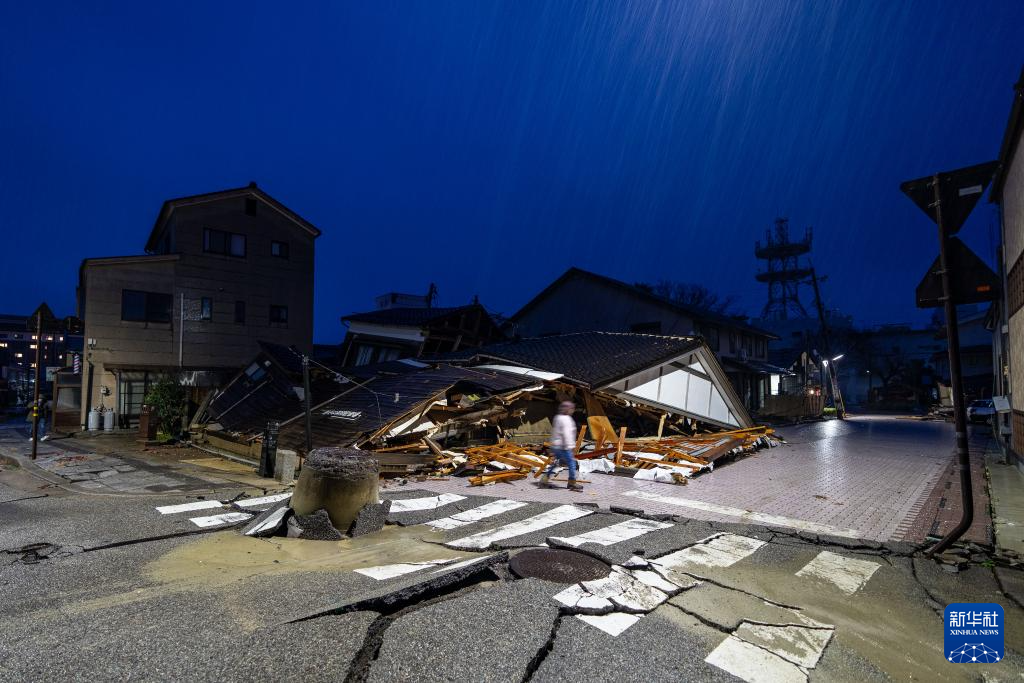 这是1月3日在日本石川县轮岛市拍摄的损毁的房屋和道路。