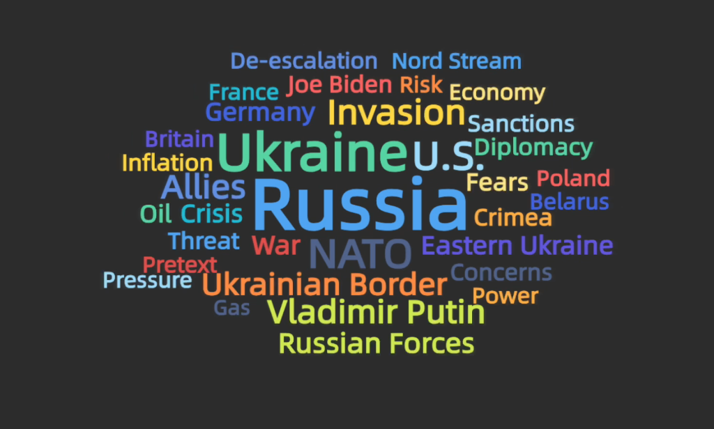 从词云图可以看出,在西方媒体的报道中,处于俄乌冲突核心位置的国家和组织是俄罗斯、乌克兰、美国和北约,而且非常强调北约国家是美国盟友的身份。