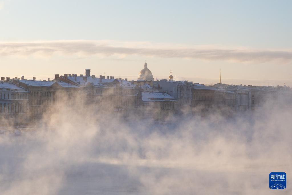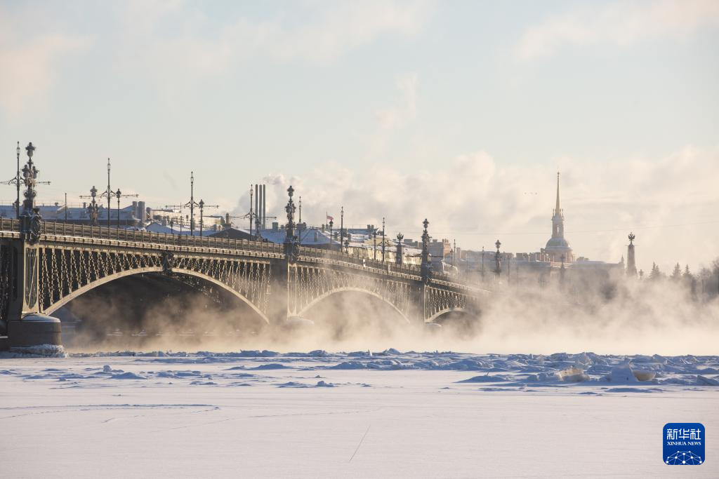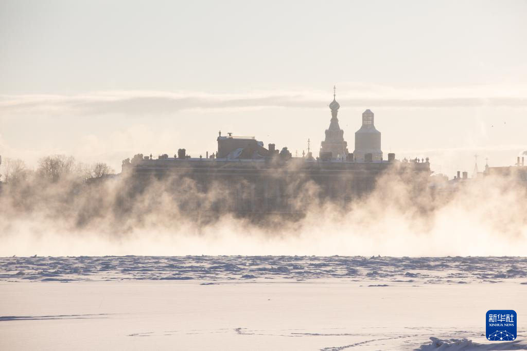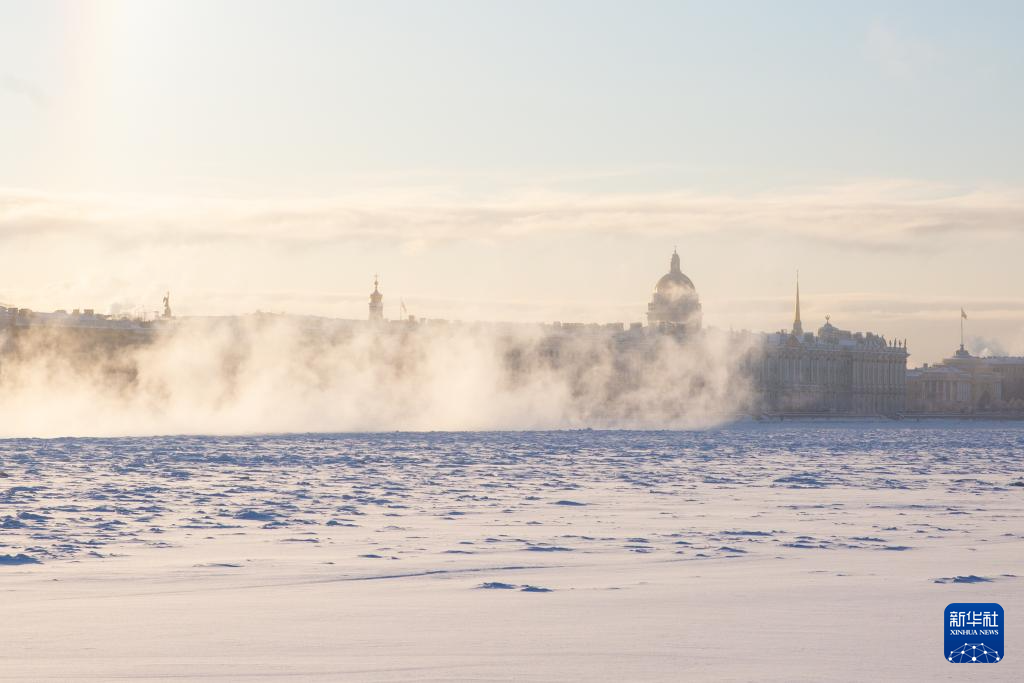 1月4日,在俄罗斯第二大城市圣彼得堡,结冰的涅瓦河上冰雾弥漫。