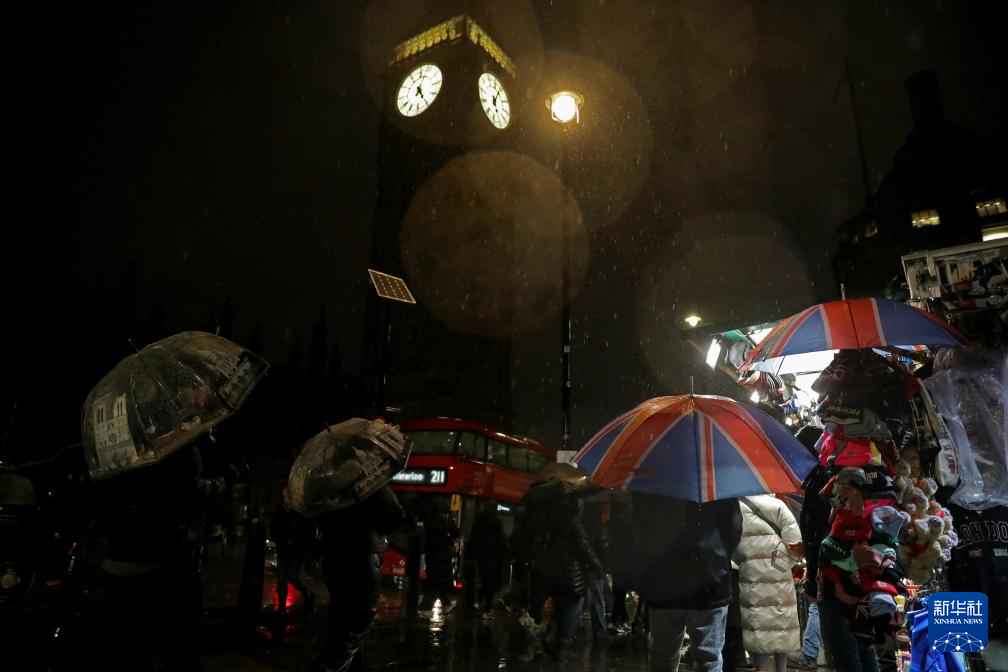 1月4日,在英国伦敦,人们撑伞行走在大本钟附近。