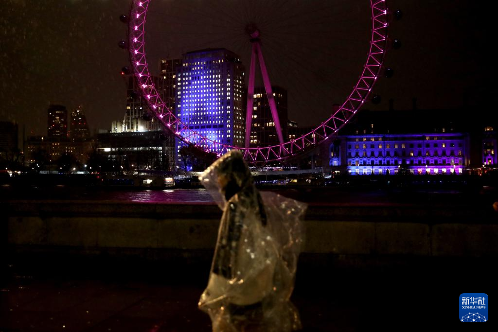 1月4日,在英国伦敦,行人身穿雨衣走在伦敦眼附近。