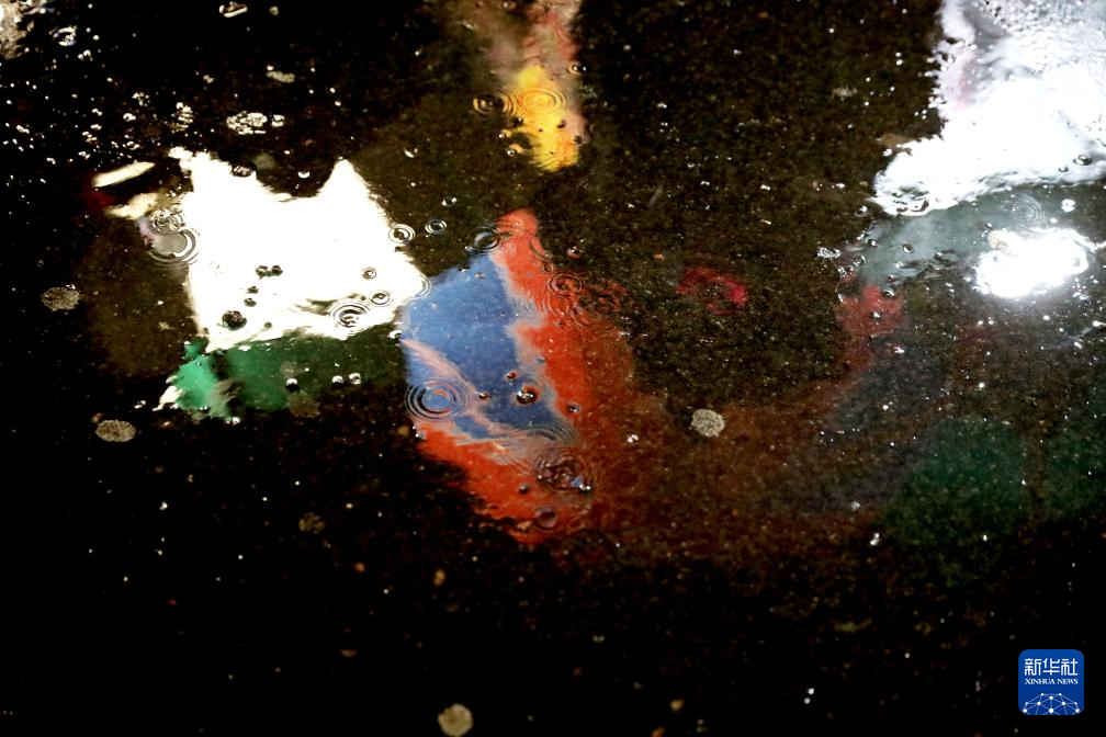 这是1月4日拍摄的英国伦敦路面积水中行人撑伞的倒影。