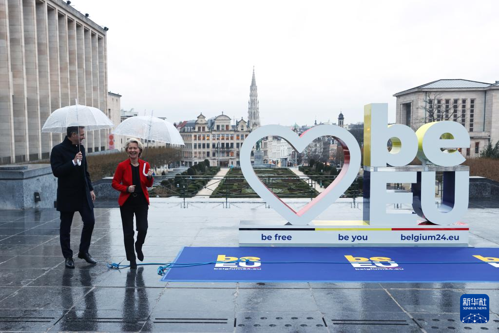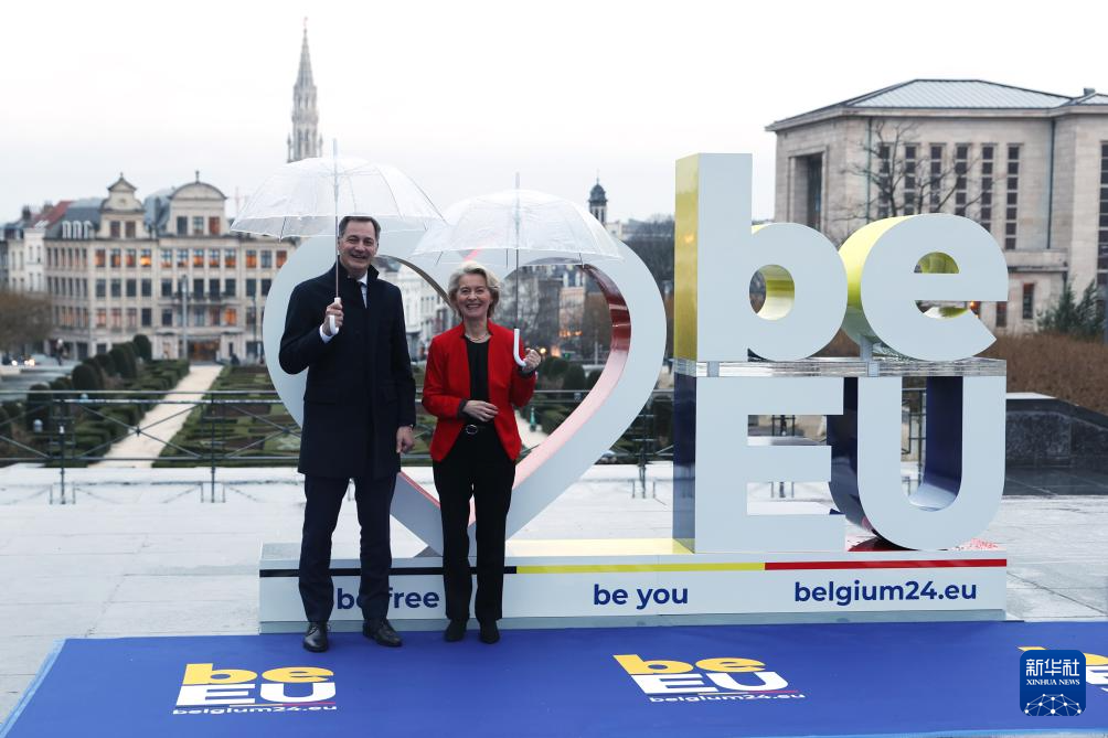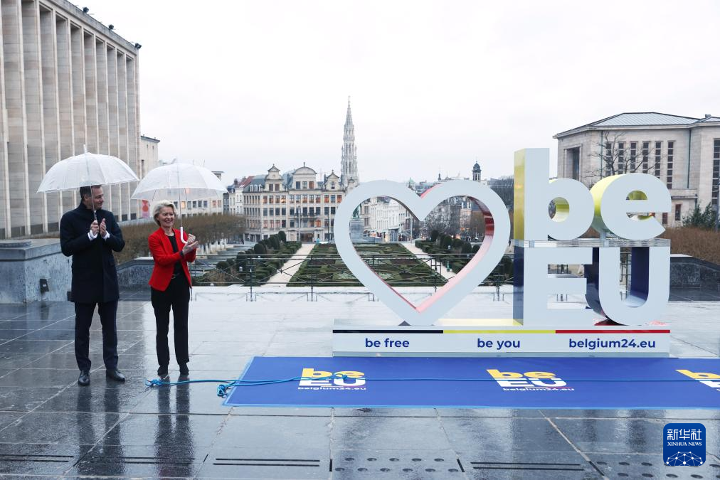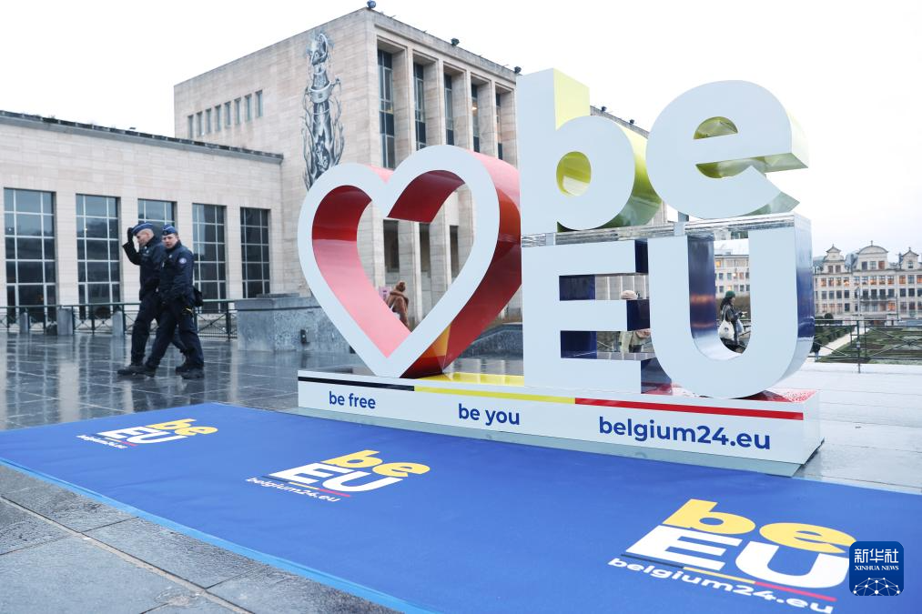 这是1月5日在比利时布鲁塞尔拍摄的比利时担任欧盟轮值主席国标志。