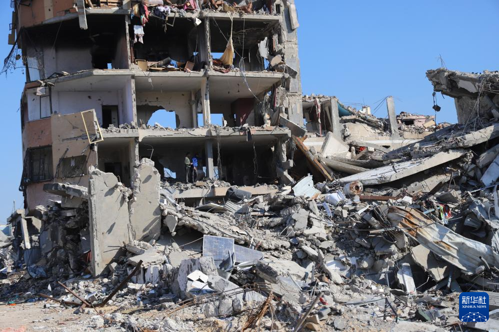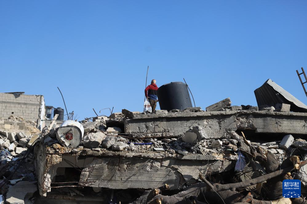 1月6日,一名男子站在加沙城的建筑废墟上。
