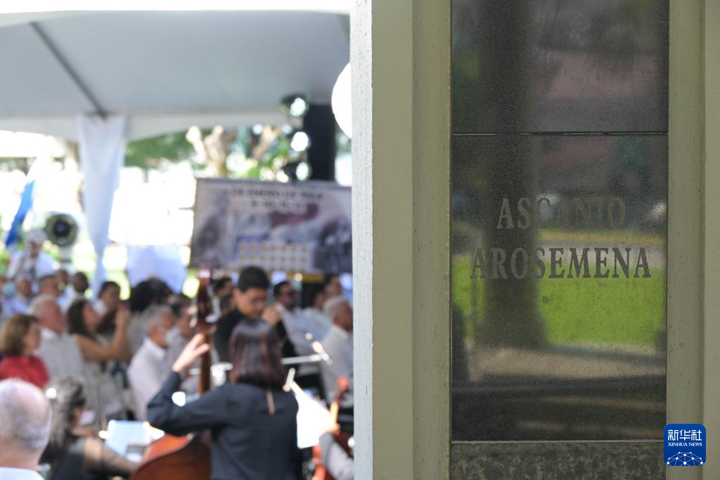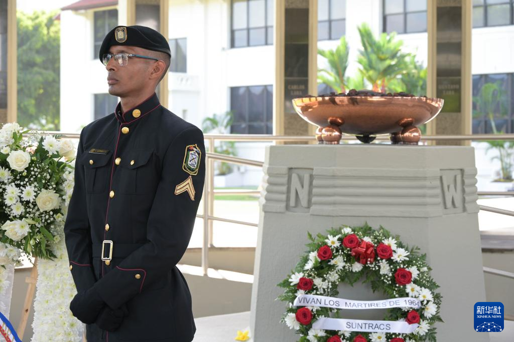 1月9日,在巴拿马首都巴拿马城,巴拿马政府在“永恒之火”纪念碑旁举办“护旗运动”60周年纪念仪式,照片中的石柱纪念的是在美国军警镇压中死亡的第一位学生阿罗塞梅纳。